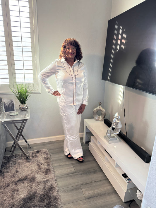 Ivory 2-Piece Pants Set with Brown Trim - Tall Girl Friendly