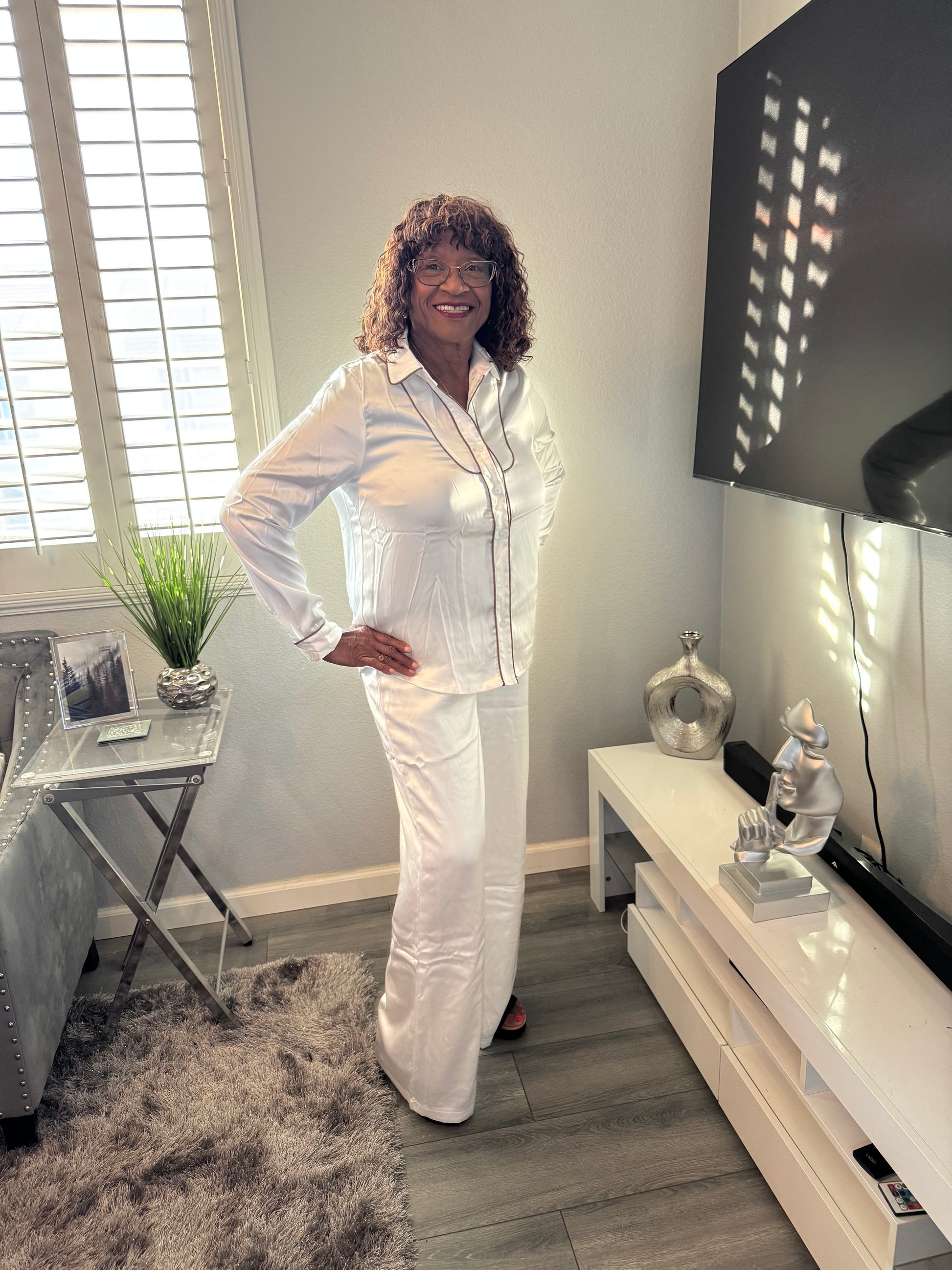 Ivory 2-Piece Pants Set with Brown Trim - Tall Girl Friendly